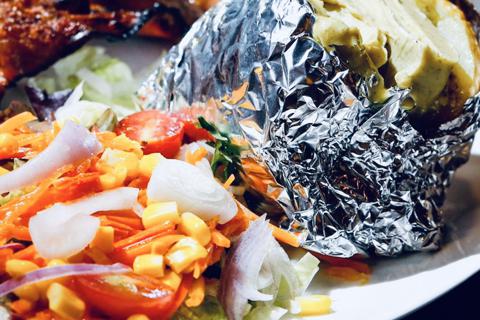 Ensalada fresca con lechuga, cebolla, tomate, maíz y nuestra patata CanRibs.