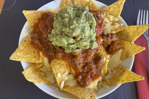 Nachos con queso fundido , guacamole y nuestra salsa especial con carne de ternera ,,,,